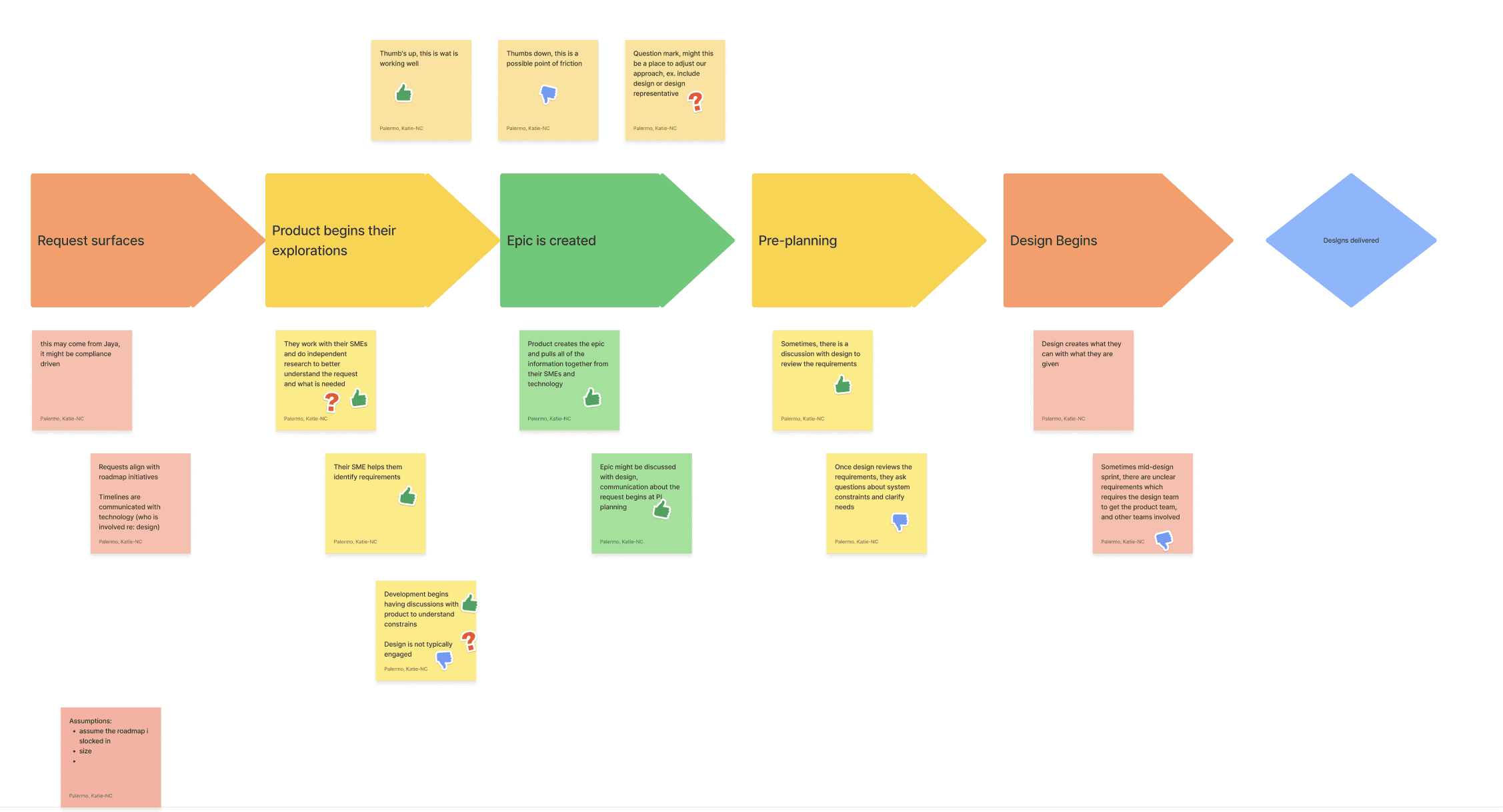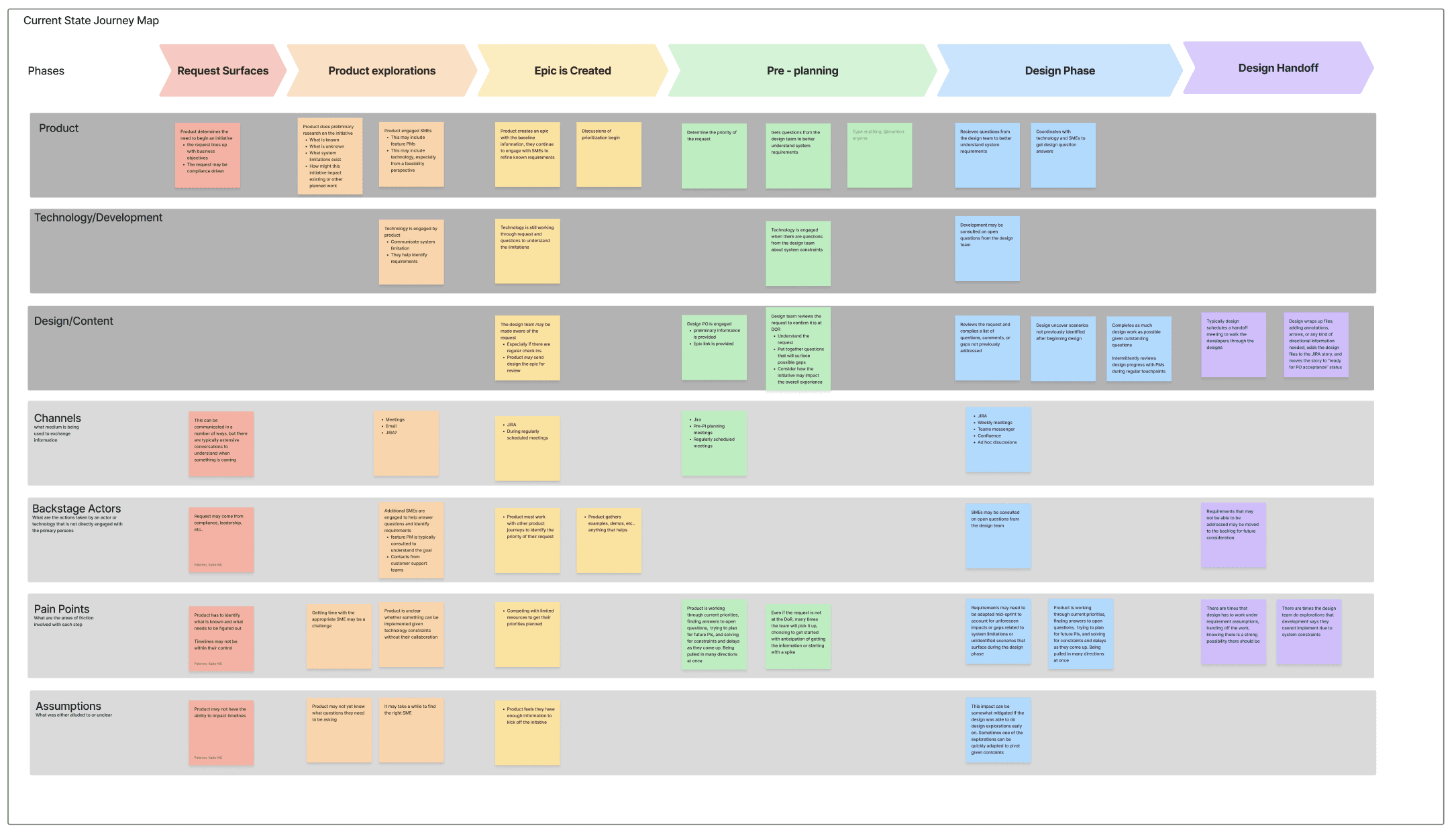 To continue reinforcing the issues at hand, a process map was created. The stages correlate with the flow chart and this breaks down each groups' responsibilities, the tools they used, pain points, and assumptions.