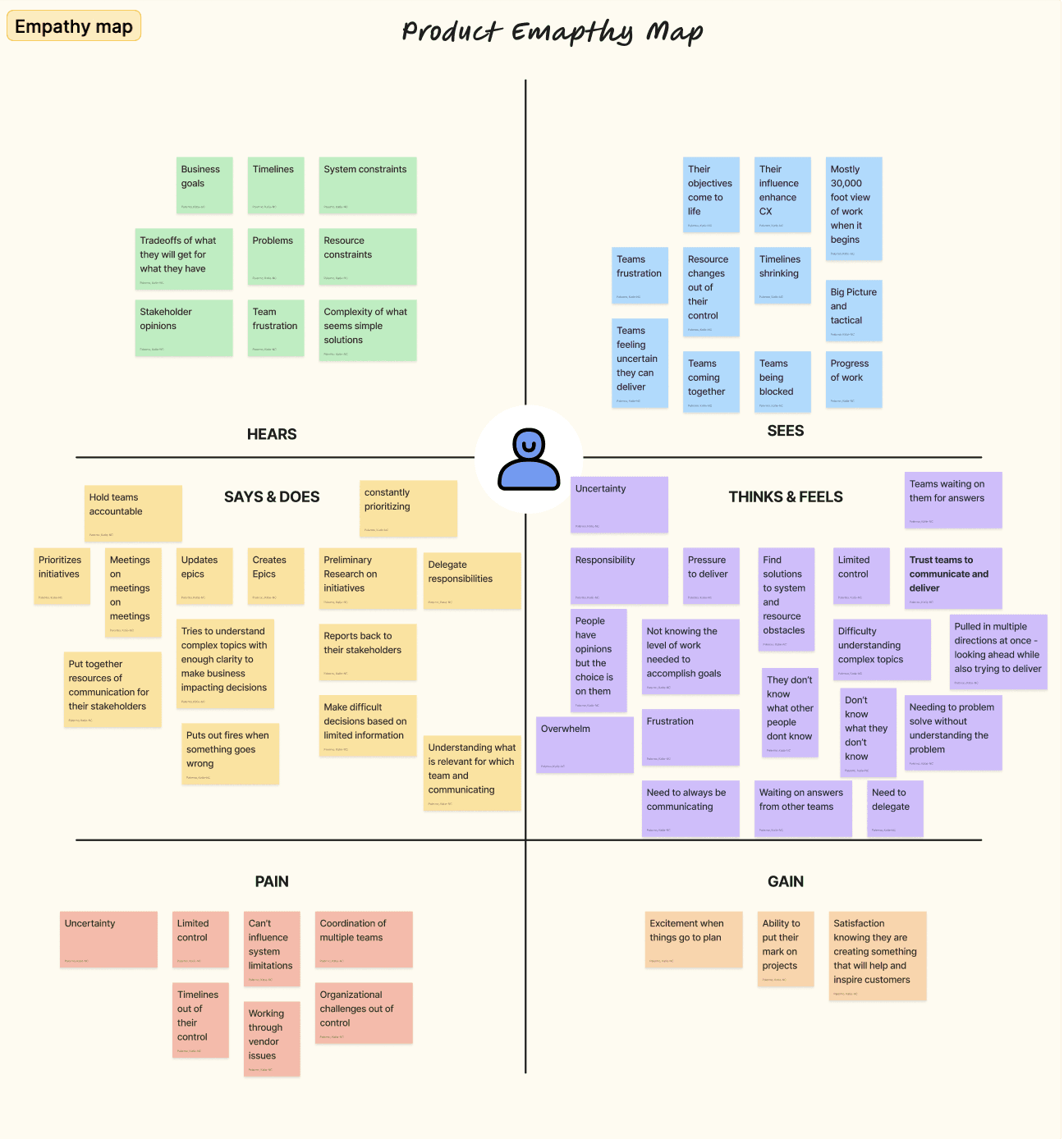 The UX team had no ability to get the product team on board with this project. Therefore, taking information learned in the listening tour, an empathy map was created.